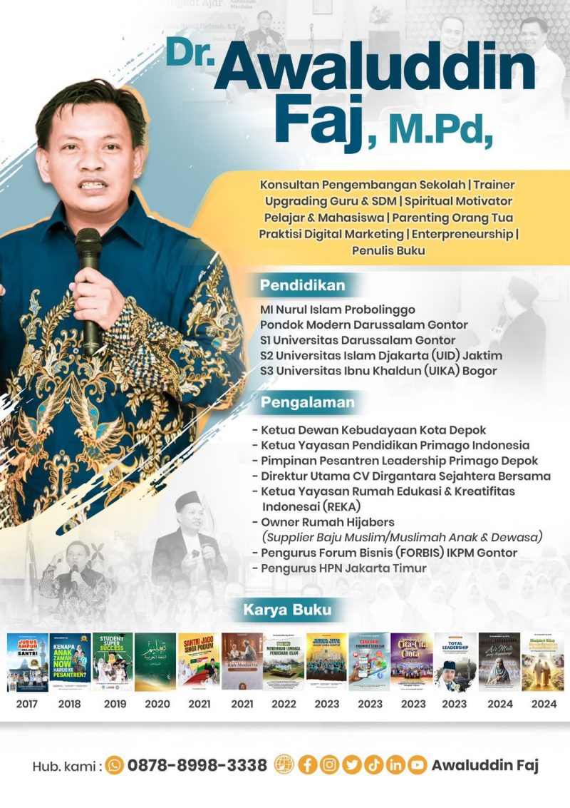 Selain sebagai trainer, motivator, dan entrepreneur, Dr Awaluddin Faj, M.Pd menjadi Konsultan Pendidikan Islam dan Praktisi Promosi dan Branding Lembaga.