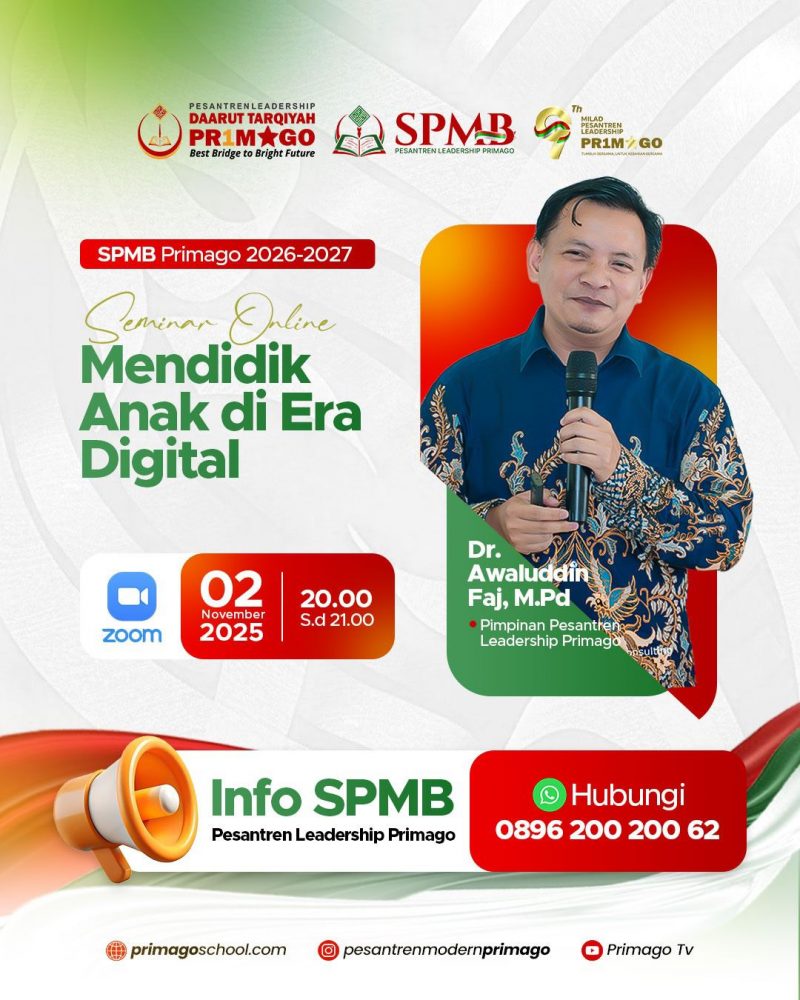 Alhamdulillah pada kesempatan ini, Pesantren Leadership Primago mengadakan kegiatan seminar online dengan tema “Mendidik Anak di Era Digital” yang di isi oleh Dr Awaluddin Faj, M.Pd.